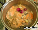 - Припустить лосося в рыбном бульоне из воды и вина, с добавлением лаврового листа, тимьяна, лука и гвоздики, в течение 20 минут.
