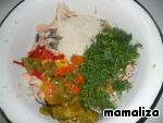 - Вытащить рыбу из бульона, остудить, отделить от кожи и костей, немного измельчить. Добавить лимонный сок, сухари, вустерский соус, тертый лук, петрушку, зеленый и красный перец.