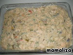 - Соус перемешать с рыбой. Яйца взбить и добавить в рыбную смесь. Форму для запекания смазать маслом. Смесь выложить в форму.