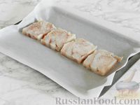 - Духовку разогреть до 200 градусов. Филе трески разделать порционно и выложить на противень, застеленный пергаментом. Посолить и поперчить рыбу.
