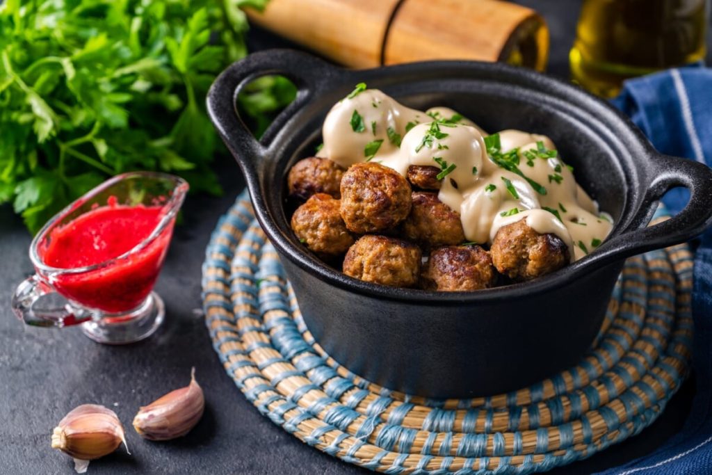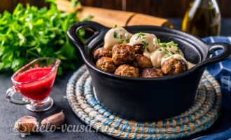 - Готовые фрикадельки вынимаем из духовки и поливаем сливочным соусом. Традиционно шведские фрикадельки подают с картофельным пюре и сливочным и брусничным соусом.