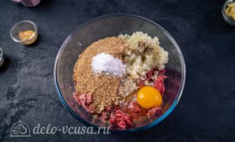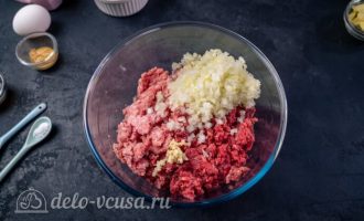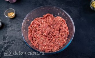 - Соединяем говяжий (500г.) и свиной (250г.) фарш, пропущенный через пресс чеснок (1 зубчик) и мелко нарезанный репчатый лук (1 шт.).