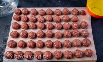 - Смоченными в воде руками лепим небольшие фрикадельки и складываем из на застеленную пергаментом доску. Размер фрикаделек 2,5-3 см, это в среднем 20-25 г. на фрикадельку.