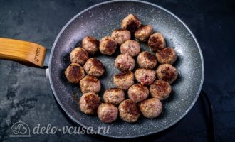 - На небольшом количестве растительного масла обжариваем фрикадельки до румяного цвета со всех сторон. Мясные шарики выкладываем на сковороду в один слой и обжариваем на сильном огне, так они быстро зарумянятся, но не успеют пустить сок.