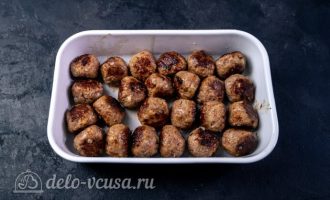- Перекладываем фрикадельки в один слой в жаропрочную форму, накрываем фольгой и отправляем в разогретую до 180 градусов духовку на 30 мин.