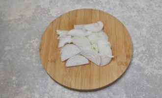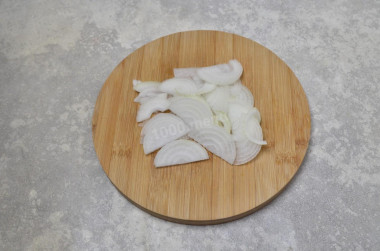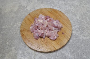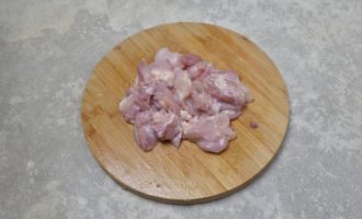 - Курицу помойте и обсушите. Снимите с бедер кожу и срежьте мясо с костей. Нарежьте срезанное мясо на кусочки среднего размера.