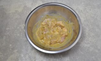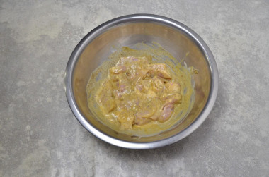 - Положите куриное мясо в миску, всыпьте к нему все специи и соль по вкусу. Влейте йогурт. Перемешайте курицу со всеми добавками. Накройте миску пленкой и оставьте минимум на 30 минут для маринования.