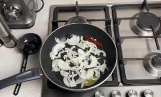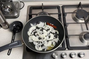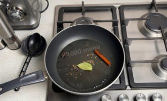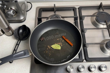 - Разогрейте на сильном огне сковороду с высокими бортиками. Налейте на нее растительное масло для жарки. Выложите в разогретое масло целые специи — палочку корицы, звездочку бадьяна, зиру, лавровый лист. Обжарьте их, помешивая, около минуты — таким образом специи отдадут маслу свой аромат. Не перегрейте масло, иначе все специи могут сгореть.