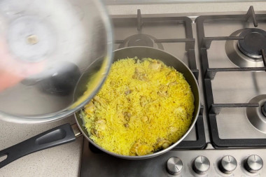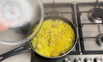 - Добавьте в сковороду рис, аккуратно разровняйте его сверху мяса. Влейте горячую воду, стараясь не перемешать продукты. Воды должно быть на палец выше риса. Накройте сковороду крышкой, нагрев сделайте минимальным. Варите бириани до полного впитывания воды. Если она впиталась, а рис еще не готов, то влейте еще горячей воды. Перемешивайте блюдо только после полной готовности.
