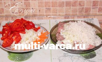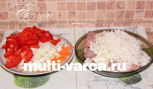 - Помоем овощи, очистим лук и морковь от кожуры, а болгарский перец от семян. Мелко порежем луковицу, морковь натрем на крупной терке, перец порежем соломкой. В фарш кладем половину порезанного лука, соль и промытый мульти стакан риса. Отобьем фарш об стол, чтоб ежики не распадались. Кто-то может положить в фарш сырое яйцо или сметану. Можно также добавить специи по своему вкусу.