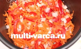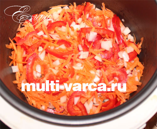 - В мультиварку наливаем растительное масло и пассируем овощи в мультиварке в течение 10 минут.