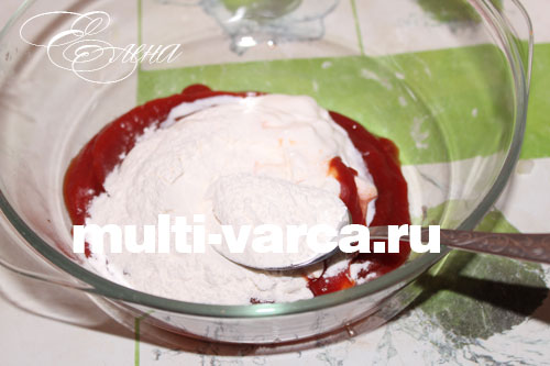 - В это время приготовим соус или подливу. Смешаем сметану, муку и томатную пасту.