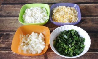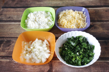 - Брынзу и твердый сыр натрите на крупной терке. Репчатый лук очистите от шелухи и нарежьте мелким кубиком. Зеленый лук и петрушку вымойте и измельчите — у петрушки предварительно срежьте стебли.