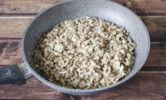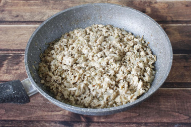 - Разогрейте на сковороде растительное масло, одновременно выложите измельченный лук и фарш, добавьте соль и специи по вкусу. Тушите на умеренном огне при помешивании до испарения жидкости — примерно 15 минут. Попробуйте фарш на вкус, при надобности добавьте соль и специи. Немного остудите фарш.