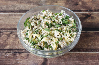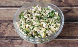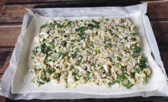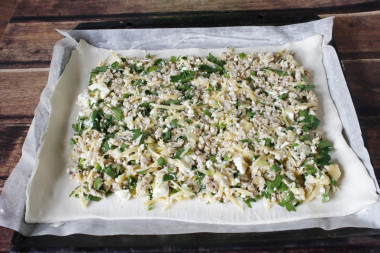 - Смешайте в удобной глубокой посуде все продукты для начинки: фарш, брынзу, твердый сыр и зелень. Влейте яичную массу, оставьте немного для смазывания пирога. При необходимости можете добавить соль и специи, учитывайте, что фарш, и сыры уже соленые.