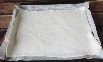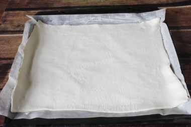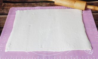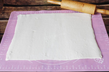 - Тесто разморозьте при комнатной температуре. Пласт разделилите еще на 2 части, так как нам понадобится два листа. Раскатайте тесто в прямоугольник размером примерно 23 на 30 сантиметров.