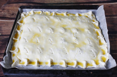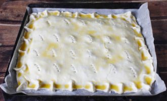 - Смажьте заготовку оставленной яичной массой и сделайте произвольные проколы вилкой в нескольких местах для выхода пара.