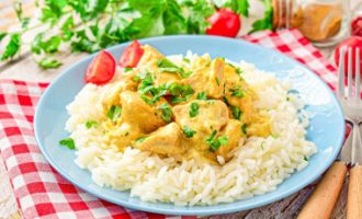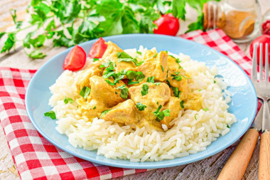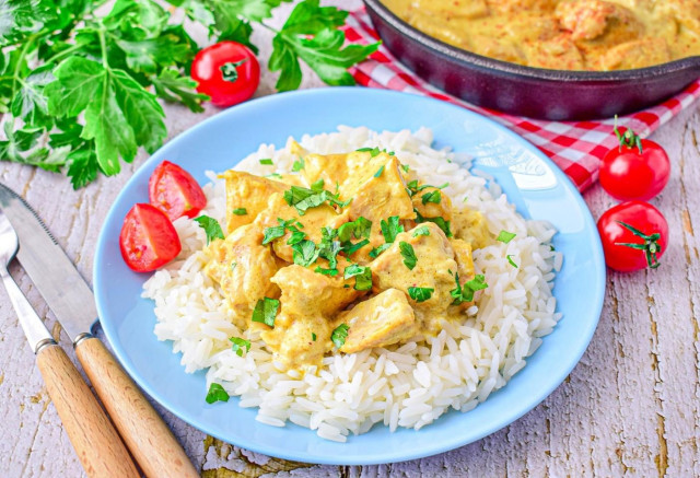 - Прогрейте всё ещё минуту и снимите с огня. Курица с карри готова.