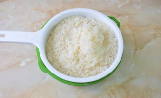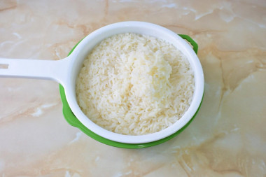 - Опустите промытый рис в кипящую подсоленную воду и варите минут 20 до готовности. Рис должен стать мягкий, но не разваренный. Опирайтесь на информацию на упаковке. Готовый рис откиньте на дуршлаг.