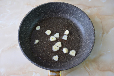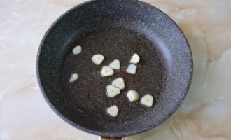 - Очистите чеснок. Сковороду для жарки разогрейте до горячего состояния и налейте на неё растительное масло. Выложите нарезанный чеснок и обжарьте его в течение минуты. Он отдаст свой аромат маслу.