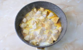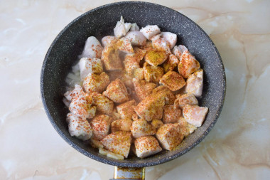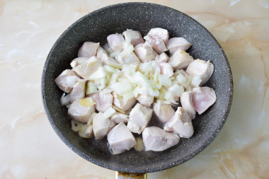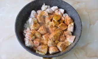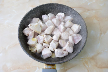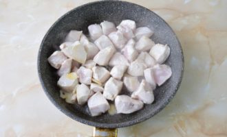 - Выложите в сковороду нарезанную курицу и обжарьте 3-4 минуты, чтобы она поменяла свой цвет.