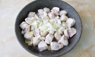 - Очистите и измельчите лук. Добавьте его в сковороду к курице
