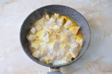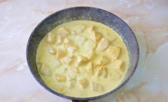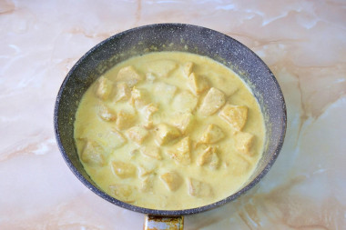 - За время тушения куриное мясо успеет приготовиться и пропитаться специями. Влейте в сковороду сливки и доведите до кипения. Чем жирнее будут сливки, тем нежнее будет вкус. Количество и густоту соуса можно отредактировать сливками и водой.